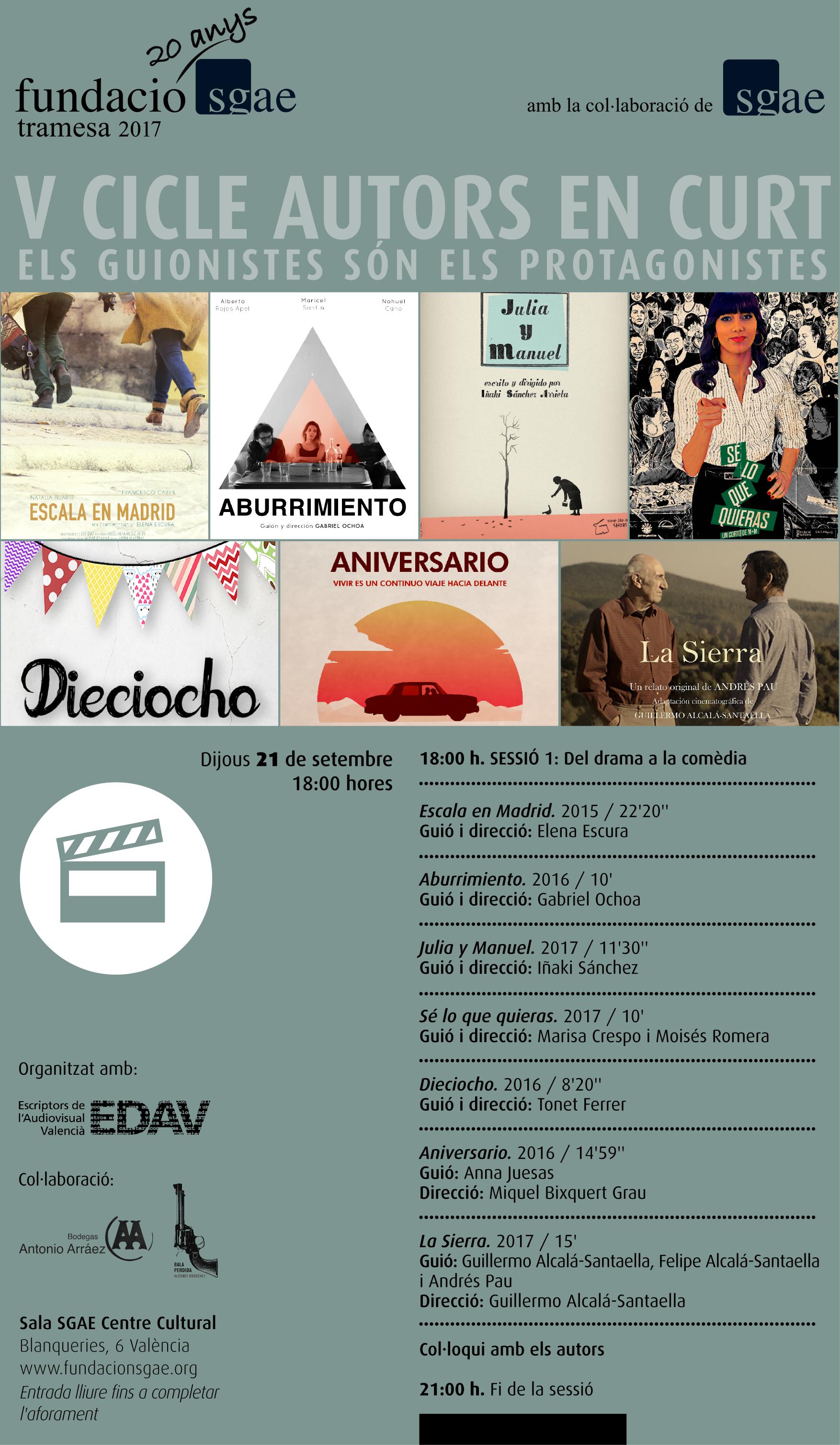 L’associació de guionistes de la Comunitat Valenciana, Escriptors de l’Audiovisual Valencià (EDAV)i la Fundació SGAE, a través del Consell Territorial de SGAE de la Comunitat Valenciana convoquen la selecció de treballs per a la VII edició d’AUTORS EN CURT, mostra de Curtmetratges Valencians.
