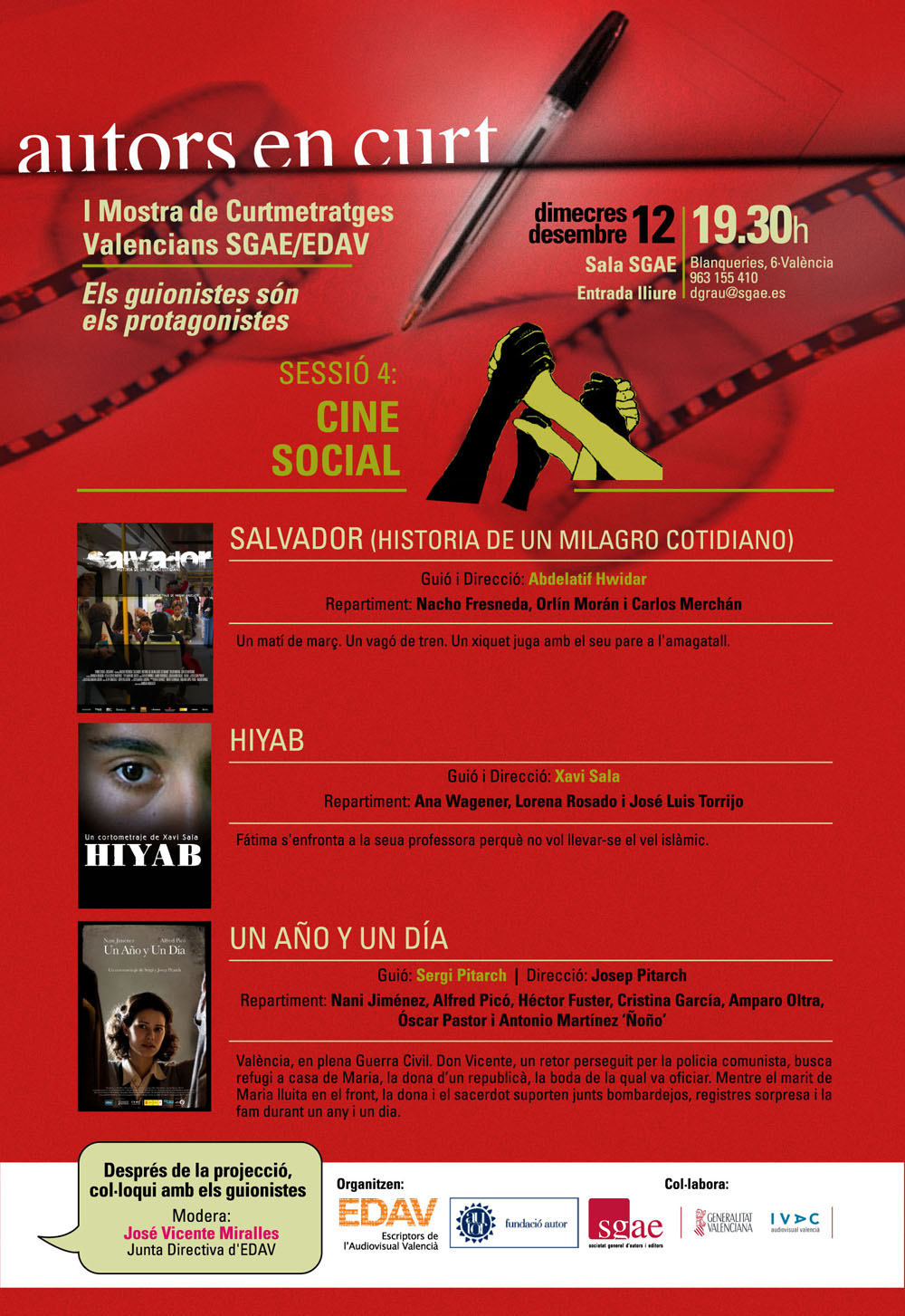 Conclou la primera temporada d’Autors en curt, la mostra de curtmetratges valencians organitzada per EDAV i la SGAE. Serà el dimecres 12 de desembre, a les 19’30 hores, en la Sala SGAE de València (C/Blanquerías, 6), i amb una sessió dedicada al cinema de temàtica social. El programa inclou la projecció dels curtmetratges ‘Salvador’ (història d’un miracle quotidià), amb el qual el realitzador Abdelatif Hwidar va obtenir un Premi Goya en 2008; ‘Hiyab’ (nominat en els Goya 2006 i guardonat en més d’una trentena de festivals de tot el món), de Xavi Sala; i ‘Un any i un dia’ (primer premi en el Festival de Cinema Històric de Saix i en Quartmetratges 2011), de Sergi Pitarch (guió) i Josep Pitarch (direcció).