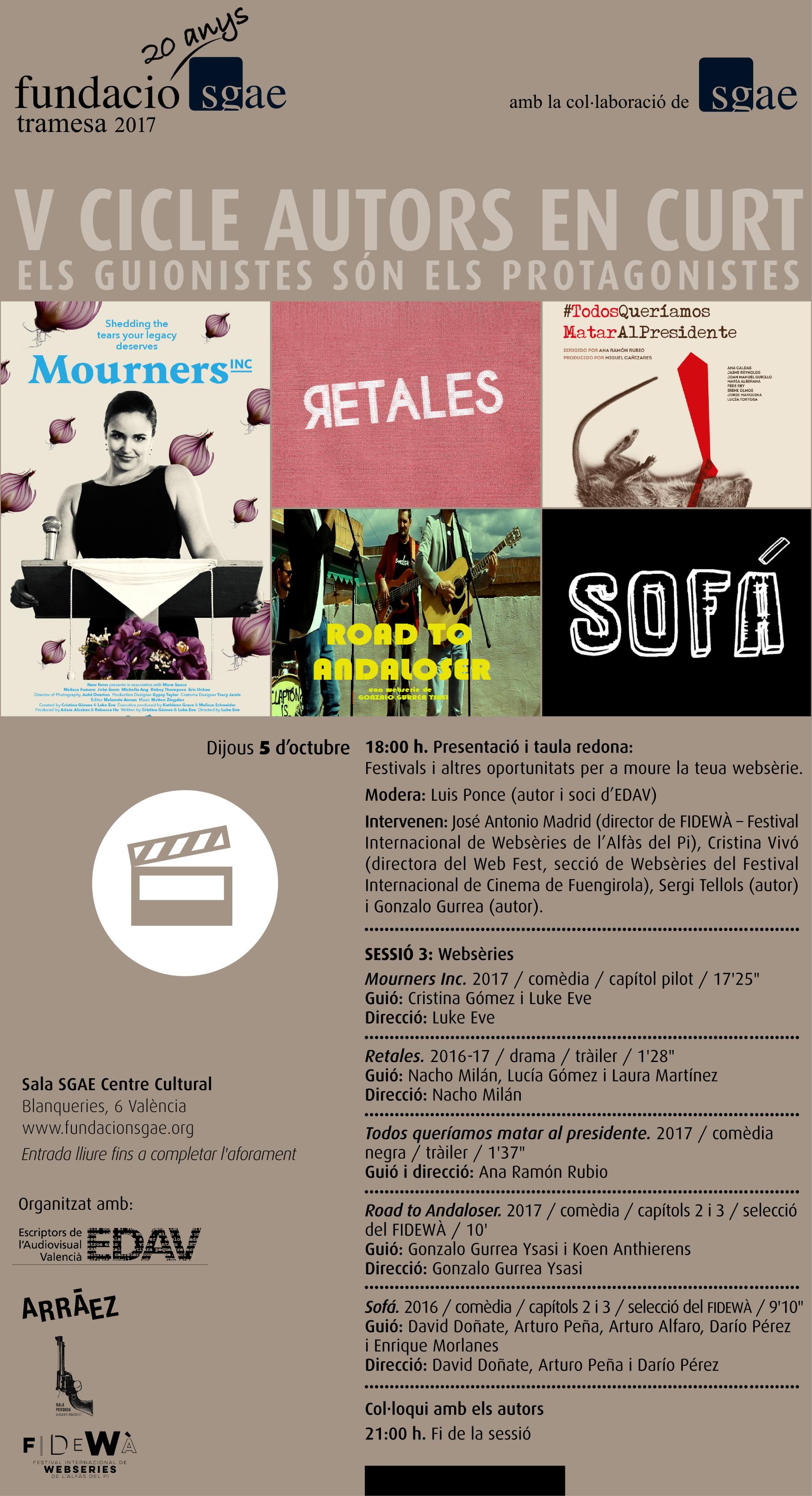 La asociación de guionistas de la Comunidad Valenciana, Escriptors de l’Audiovisual Valencià (EDAV) y la Fundació SGAE, a través del Consejo Territorial de SGAE de la Comunidad Valenciana convocan la selección de trabajos para la VII edición de «AUTORS EN CURT», muestra de cortometrajes de autores valencianos.