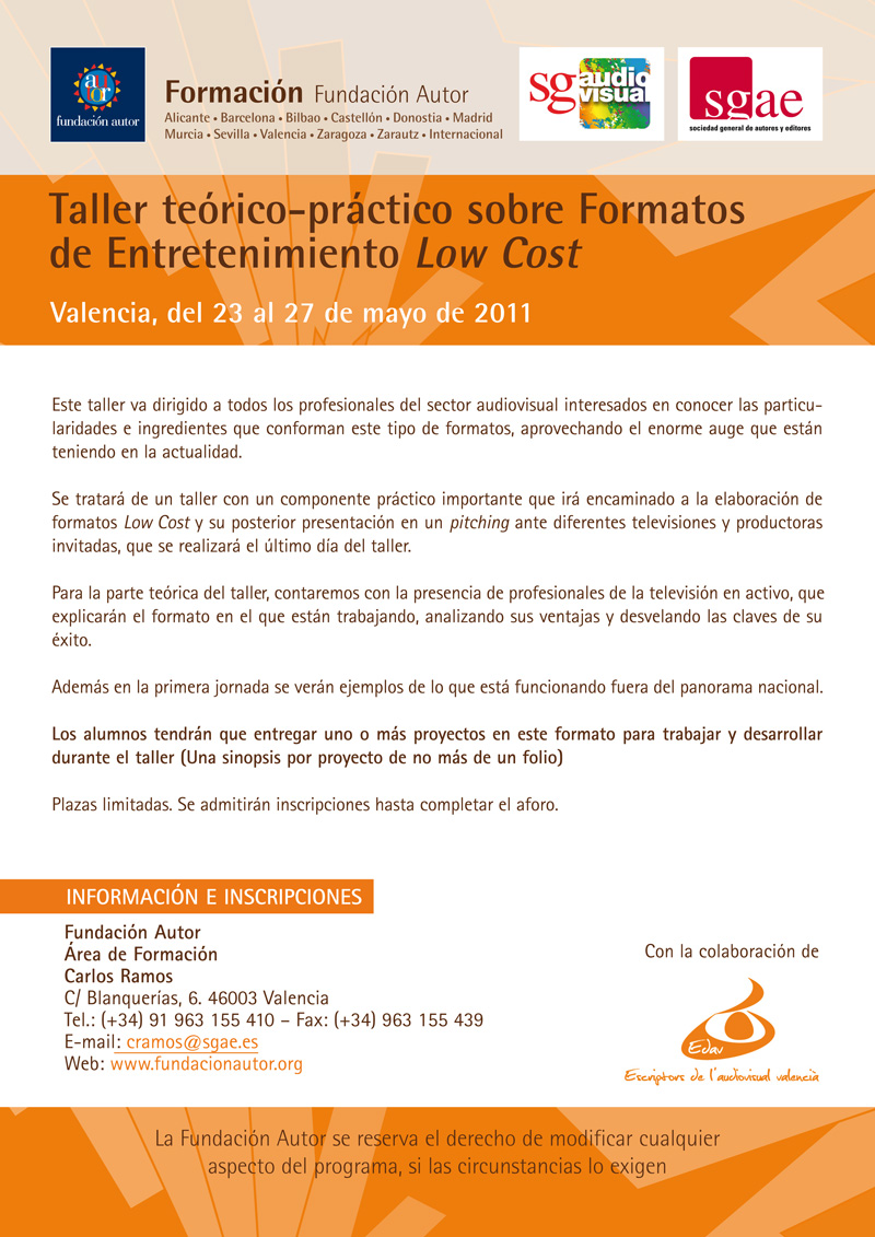 Escriptors de l’Audiovisual Valencià, en colaboración con Fundación Autor, organiza un Taller sobre Formatos de Entretenimiento Low Cost, que tendrá lugar del 23 al 27 de mayo en la sede de SGAE Valencia.