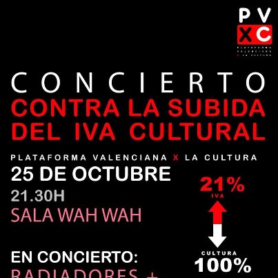 El proper 25 d’octubre, a partir de les 21.30h, la Plataforma Valenciana x la Cultura, de la qual EDAV forma part, dins de les accions a desenvolupar contra la pujada de l’IVA Cultural en 13 punts (del 8% al 21%) presenta un acte-concert amb dues bandes molt representatives de l’escena valenciana, Radiadors i Sènior i el Cor Brutal.