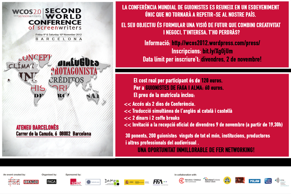 Últims dies per a inscriure’t a la trobada de guionistes més important de l’any. Tens fins el pròxim 2 de novembre. No pots faltar! Tota la informació al blog oficial de la conferència: http://wcos2012.wordpress.com/