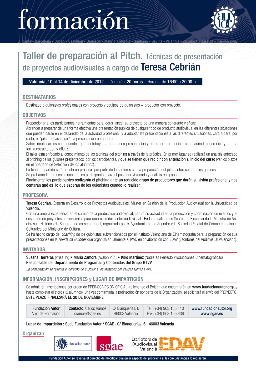 EDAV i Fundación Autor han organitzat per al pròxim mes de desembre un Taller de preparació al pitch a càrrec de Teresa Cebrián. Dirigit a guionistes professionals amb projecte i equips de guionistes + productor amb projecte, el curs té com a objectiu proporcionar als participants les eines necessàries per aconseguir llançar el seu projecte d’una manera coherent i eficaç.